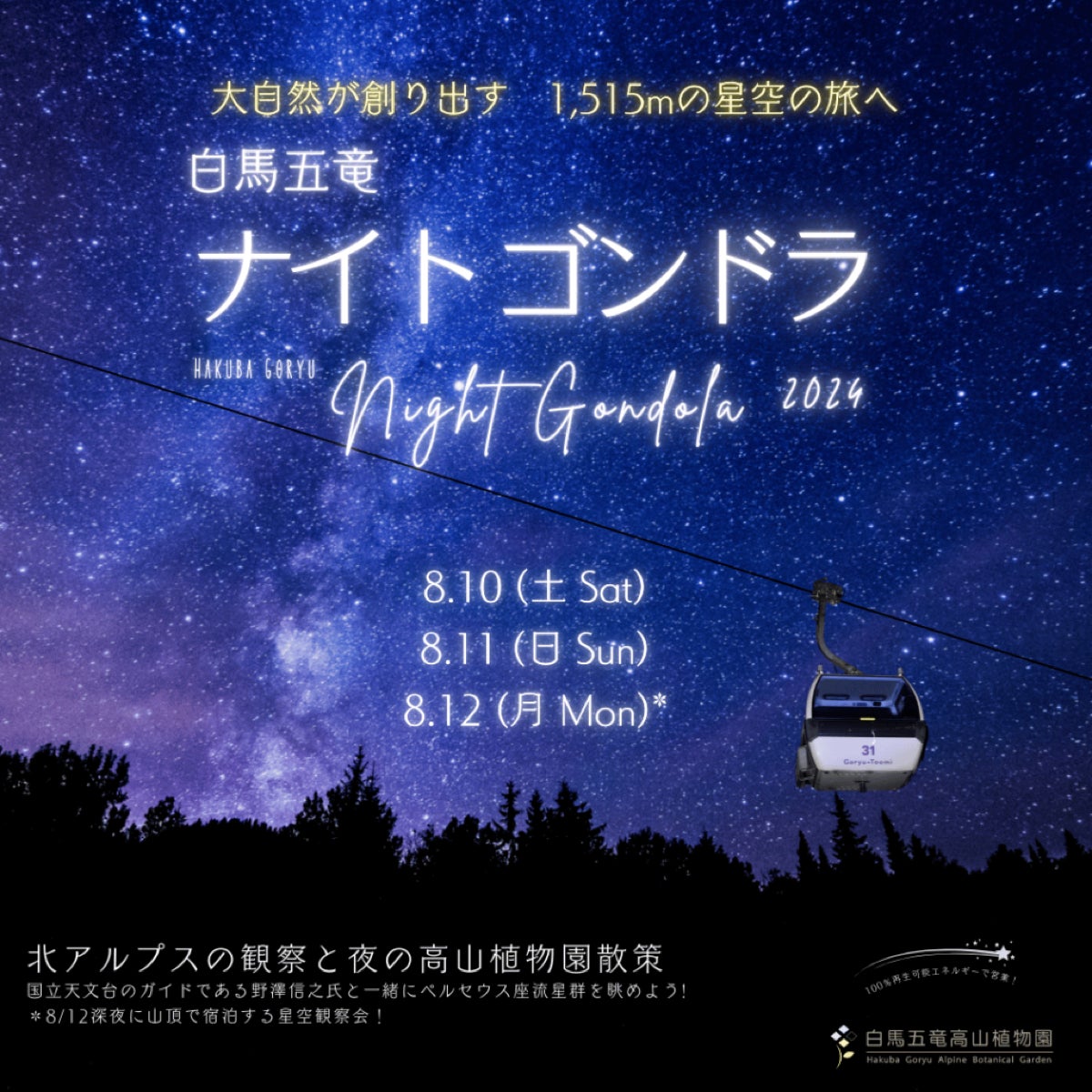 株式会社五竜(所在地:長野県北安曇郡白馬村、代表取締役社長:伊藤英喜、通称:白馬五竜)は、2024年8月より実施する、夏の山岳リゾートで涼しさを感じられるサマーシーズン企画や夏季限定メニューの詳細が決定したことをお知らせします。お盆前の8月10日(土)〜12日(月祝)に行う「星空ナイトゴンドラ」では、国立天文台三鷹ガイド・野澤信之氏による解説や、星空楽器団の演奏会、夜のワークショップなどの開催が決まりました。また、山頂レストランAlps360では夏らしい涼しげなフード&ドリンクを提供するほか、ベースセンターではハイキングのお供に長野のご当地パン「牛乳パン」を数量限定販売いたします。