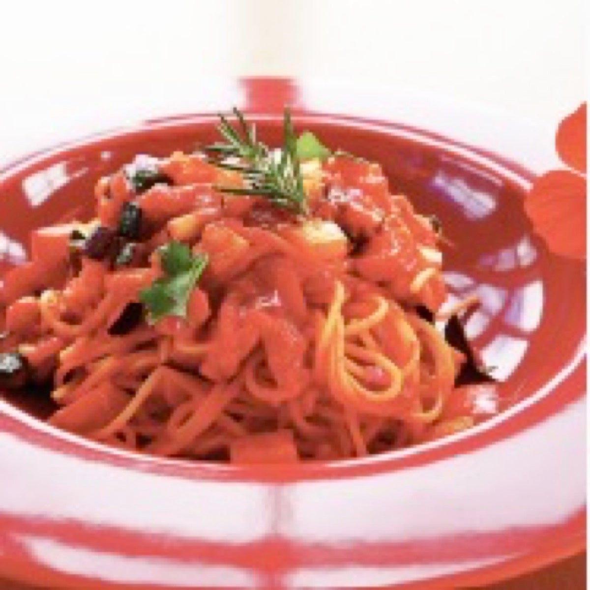 自家製トマトソースに角切りにした野菜4種が入ったトマトパスタ。