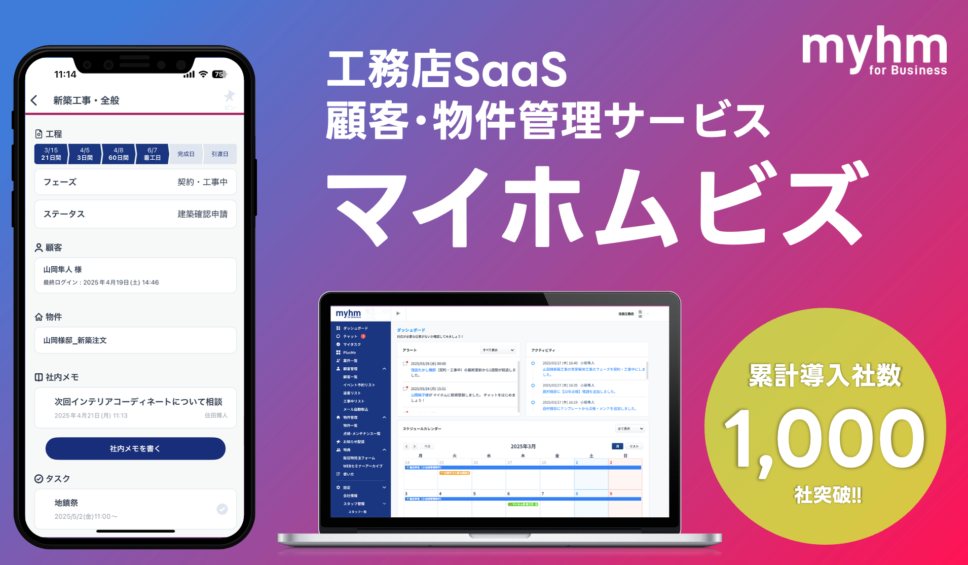 顧客満足度が向上することで、見込み客の受注率が上がり、お引き渡し後も、良好な関係構築がし易くなり、紹介案件の増加も期待できます。また、現場管理機能も備えているため、お施主様と現場の情報共有漏れに伴う、「言った言わない」などのトラブルを防ぎながら効率的に業務を進めることができます。マイホムビズは、工務店様の成長を支援する強力なパートナーで、これまで累計1,000社以上の工務店様と40,000人を超えるお施主様にご利用いただいております。
