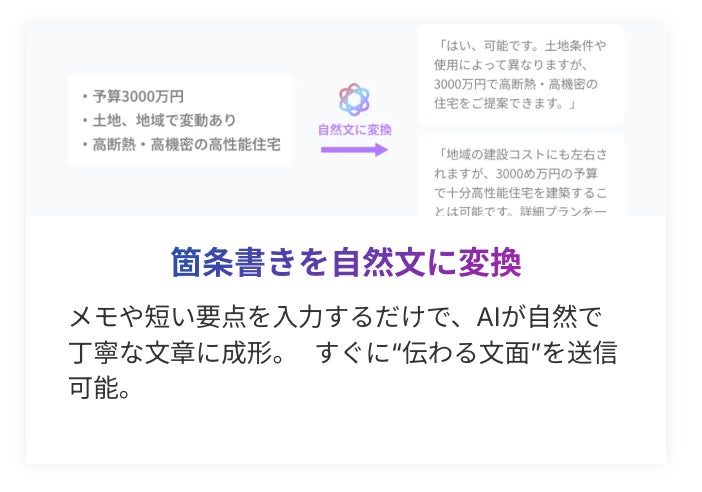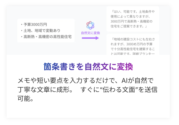 メモや短い要点を入力するだけで、AIが自然で丁寧な文章に成形。 すぐに“伝わる文面”を送信可能。