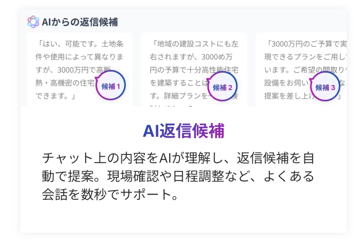 チャット上の内容をAIが理解し、返信候補を自動で提案。現場確認や日程調整など、よくある会話を数秒でサポート。