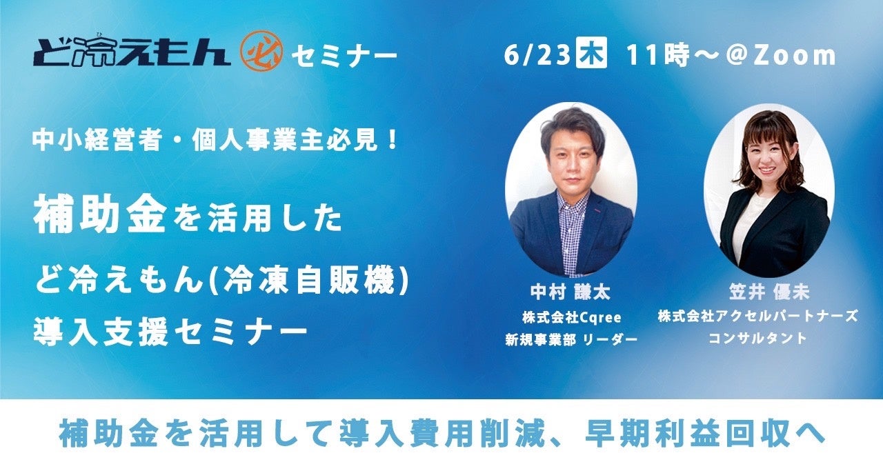 株式会社Cqree(本社:東京都品川区、代表取締役:塚本信仁)と株式会社アクセルパートナーズ(本社:愛知県名古屋市中区)は、事業再構築補助金・持続化給付金を活用して、冷凍自販機の導入をご検討の方に向けてセミナーを開催します。