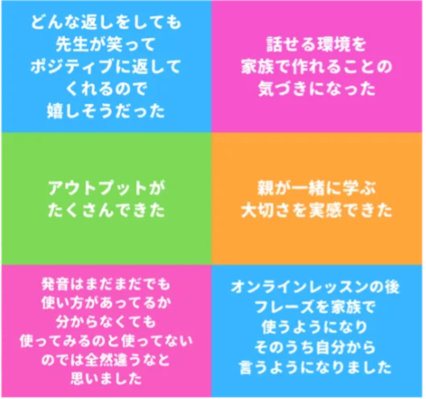 ・学童帰りでも受講できる時間だから英会話に親しめるきっかけが忙しい中でもあって助かる。