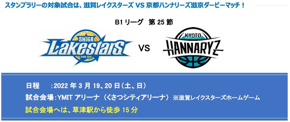 株式会社ギックス(本社:東京都港区、代表取締役:網野 知博、以下、ギックス)と、西日本旅客鉄道株式会社(本社:大阪市北区、社長:長谷川 一明、以下、JR西日本)、株式会社滋賀レイクスターズ(本社:滋賀県大津市、代表取締役社長:釜渕 俊彦、以下、滋賀レイクスターズ )は、3月19、20日(土、日)に開催するB.LEAGUE所属プロバスケットボールチーム滋賀レイクスターズと京都ハンナリーズとの「滋京ダービー」にて日本一「スタンプの位置」が高い(?)応援スタンプラリーを実施いたします。