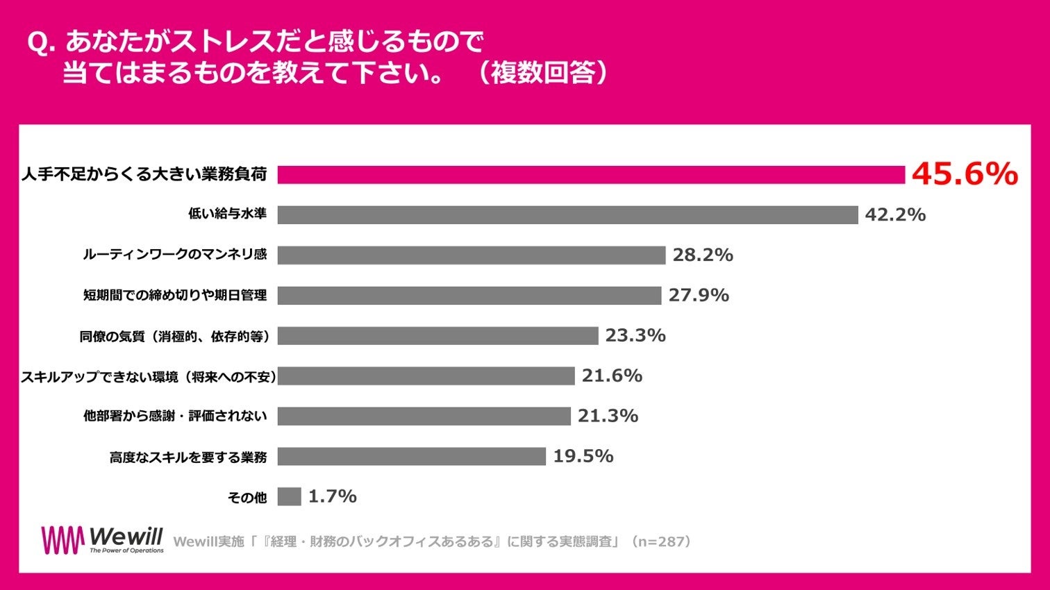 ストレスの原因は、 45.6%で「人手不足からくる大きい業務負荷」がトップ。