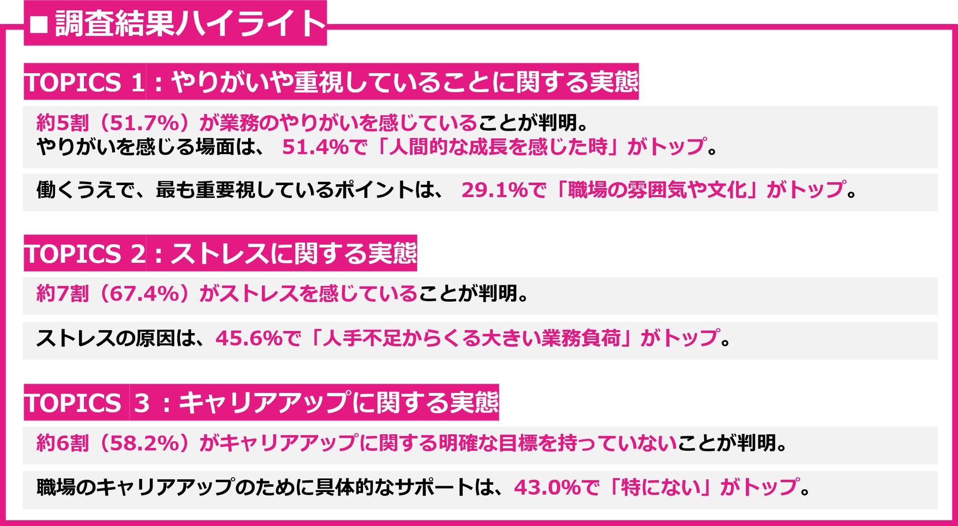 一方で、約7割の従業員がストレスを感じている課題が見受けられ、その主な原因は「人手不足による業務負荷」「低い給与水準」「業務のマンネリ化」であることが明らかになりました。また、キャリアアップに関する明確な目標を持つ人が少なく、職場でのキャリア支援体制の不十分さが課題として浮き彫りになりました。これらの課題は、従業員の満足度や長期的な定着率に影響を与える可能性があると考えます。