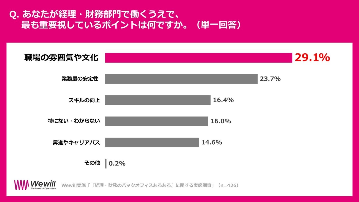 続いて、「働くうえで、最も重要視しているポイント」について聞いたところ、「職場の雰囲気や文 化」(29.1%)が最も多く、次点で「業務量の安定性」(21.7%)、「スキルの向上」(16.4%)という結果になりました。