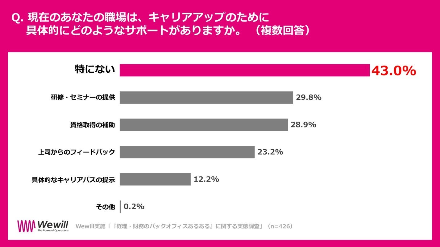 職場のキャリアアップのために具体的なサポートは、43.0%で「特にない」がトップ。