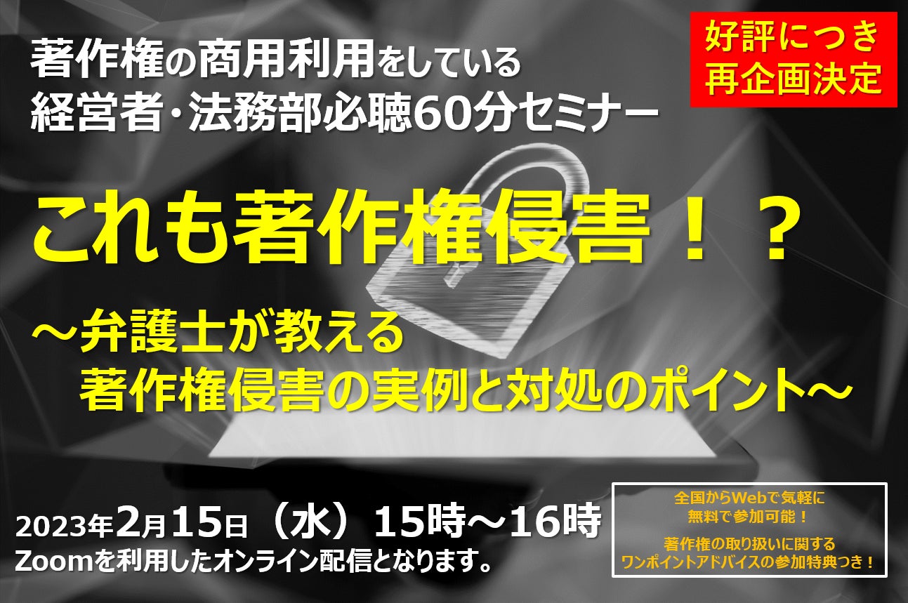『これも著作権侵害!?~弁護士が教える著作権侵害の実例と対処のポイント~(好評につき再企画)』を2月15日(水)無料オンラインで開催
