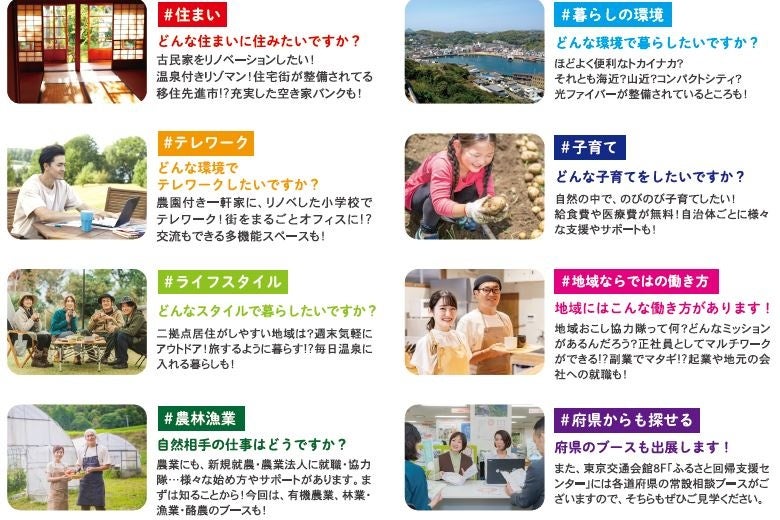 コロナ禍を経て生き方が多様化する中、自然豊かな地方で暮らしたいと移住を考える方が増えています。全国の市町村から、自分の理想の暮らしを実現できる地域を探しだすのは大変です。具体的な地域の名前を知らなくても「こんな暮らし方ができる」「こんな仕事がある」「こんな子育て環境が整っている」「テレワークにおすすめ」など、できることから地域を探すことが出来て、移住希望者と地域をつなぐ場となるよう本イベントを企画しました。