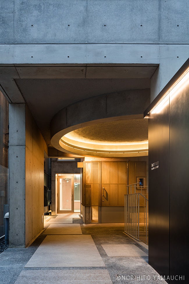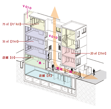 集合住宅、事務所、飲食店舗などが混在するエリアの空気感に寄り添うように、「大・小」の店舗、「20・35・75m²」の住戸バリエーションを計画し、属性の違う「商い」や「人」が自然と集まるよう意図しました。ここでは、商・住空間をゾーン分離するのではなく、両者が路地や吹き抜けを介して共存する新しい都市型複合住空間の在り方を提案しています。