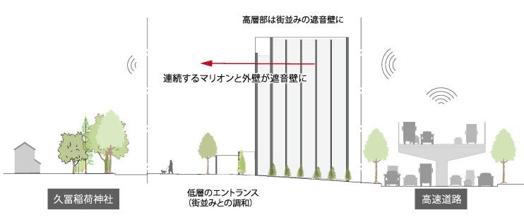 建物を9階建てに高層化して事業性を確保しながら、建物のボリュームをあえて幹線道路側に寄せて住宅街側に低層のエントランスと空地を設け、街並みの調和を図りました。建物そのものが住宅街への遮音壁の役割を果たすことで、「喧騒から静寂」へと周辺環境の構成を段階的に変換しています。