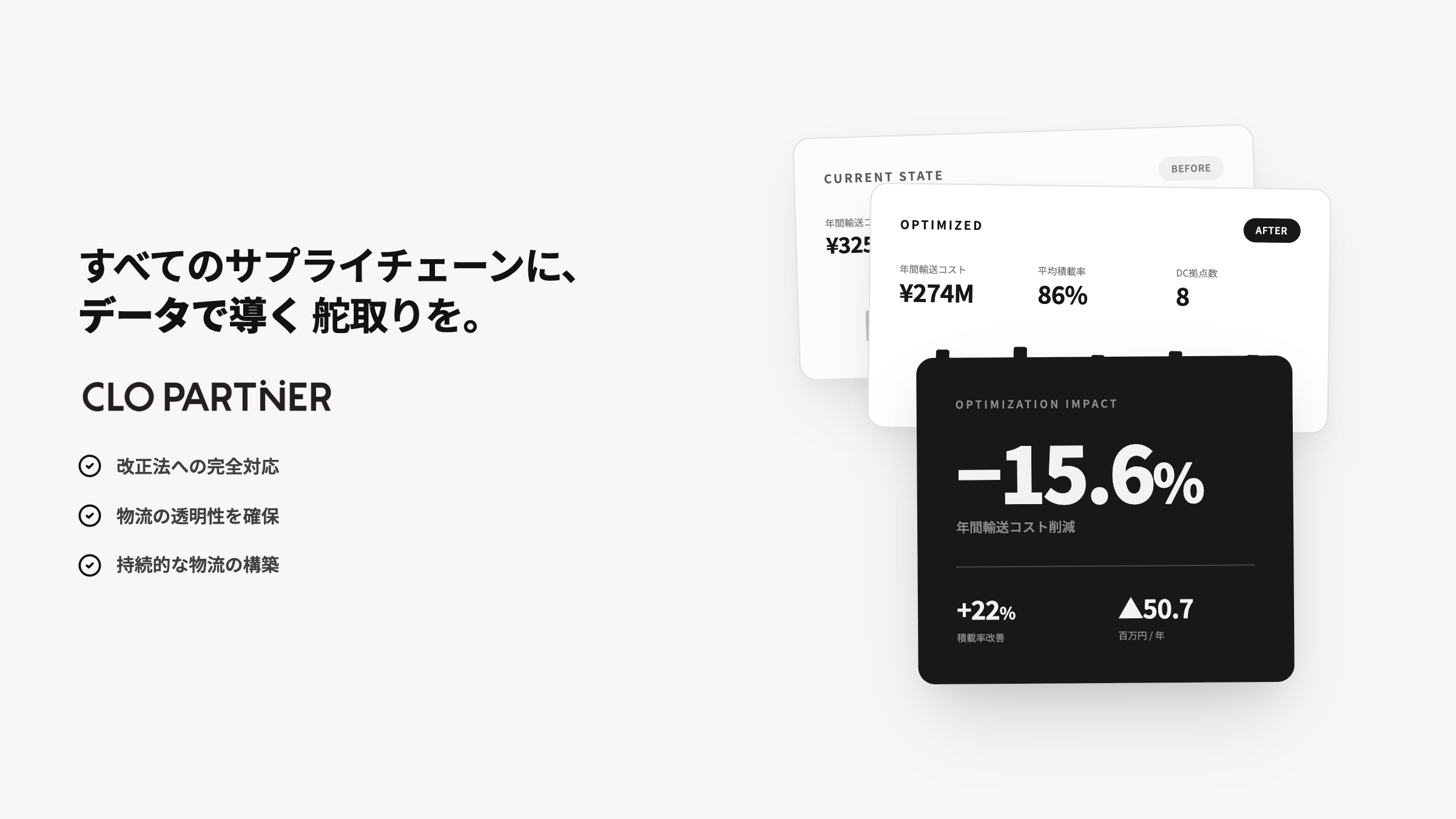 株式会社Logpose Technologies(本社:東京都千代田区、代表取締役CEO:羽室行光、以下「Logpose」)は、物流効率化法への対応を契機に、荷主企業のCLO(物流統括管理者)体制づくりと物流改革を“実行まで”伴走支援する新サービス「CLO Partner(シー・エル・オー パートナー)」の提供を開始しました。