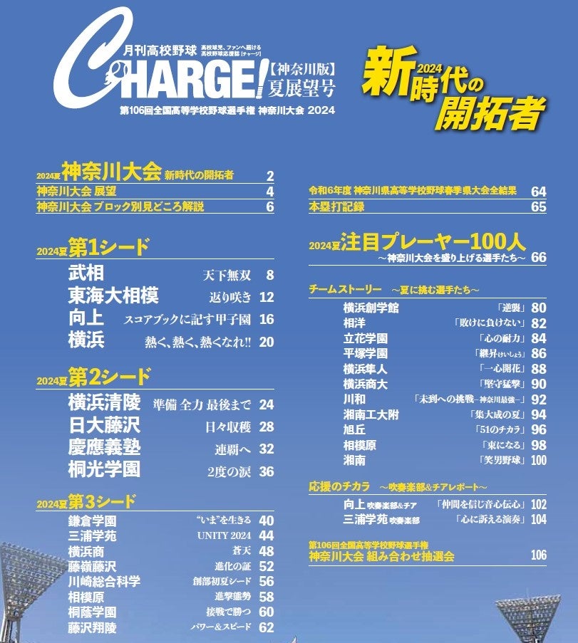 毎月各学校を密着取材しているCHARGE!取材班は、その信頼と実績、そして確かな取材力から今年も夏展望号を発売します。毎月の発行号と同様にフルカラーで、140ページの圧倒的なボリュームで大会のレポートや注目プレイヤーなどの情報が満載です。