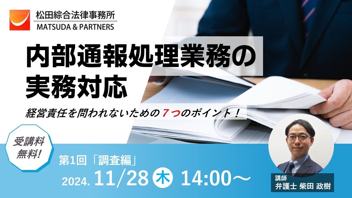 ※事業経営者様及びコンプライアンス担当役員様向け※【2024年11月28日開催】連続WEBセミナー♢第1回 内部通報処理業務の実務対応~経営責任を問われないための7つのポイント~♢