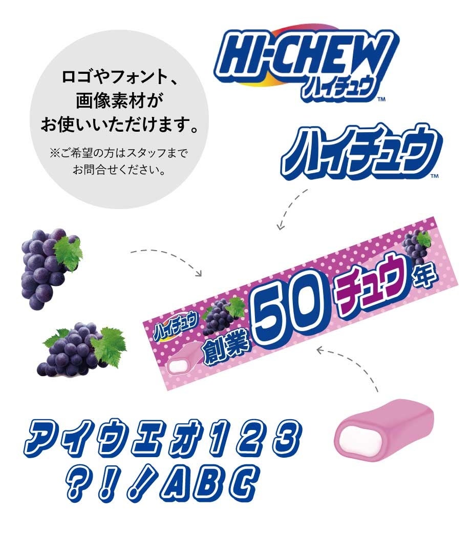 さらに、ハイチュウのデザインシミュレーターには、ハイチュウ専用フォントもご用意。ハイチュウらしいポップなフォントを使って、注目度抜群のオリジナルお菓子が作成できます。