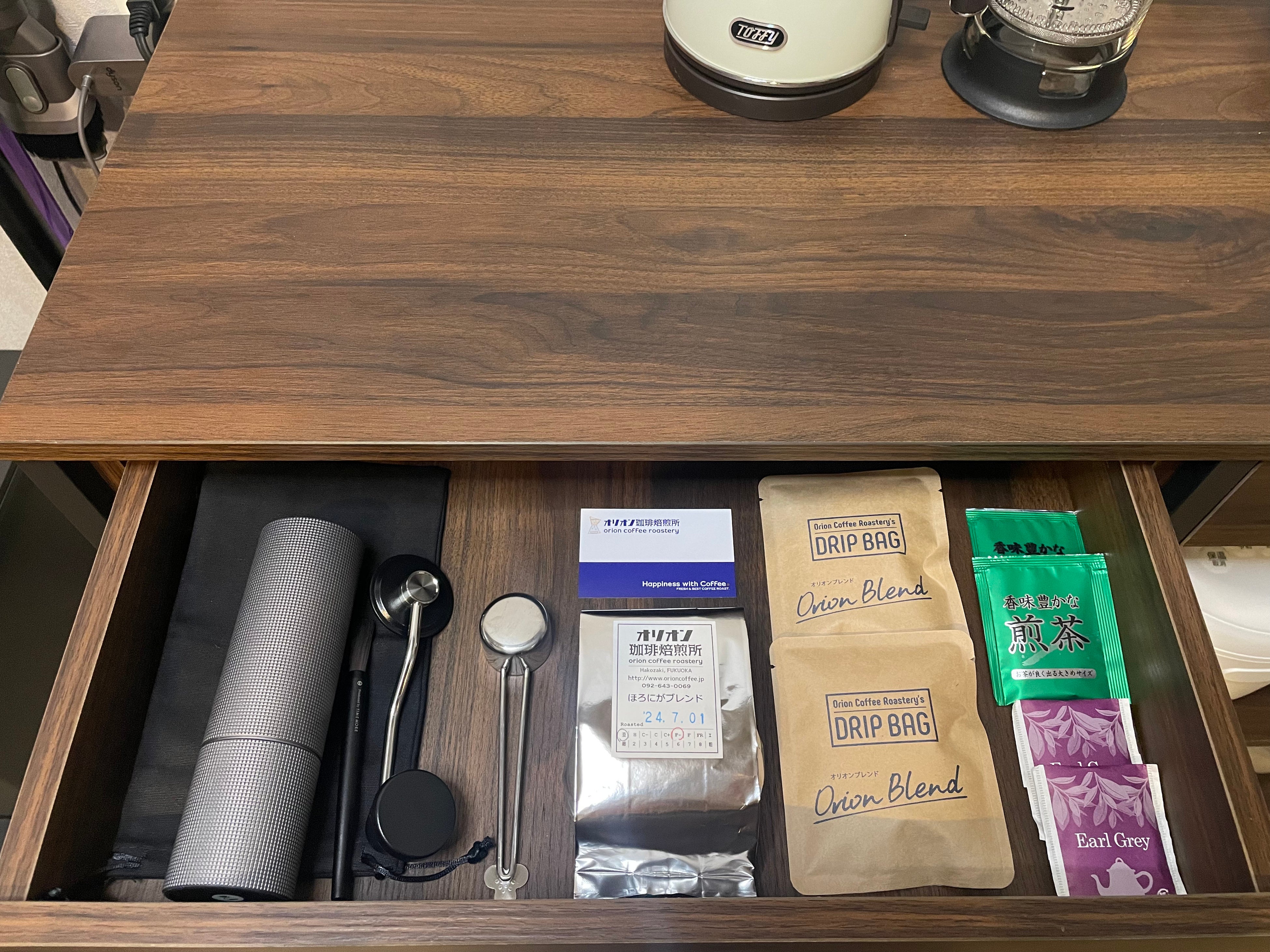 【ミニバー】:コーヒー・紅茶・緑茶・ミネラルウォーター、調理器具一式、調味料