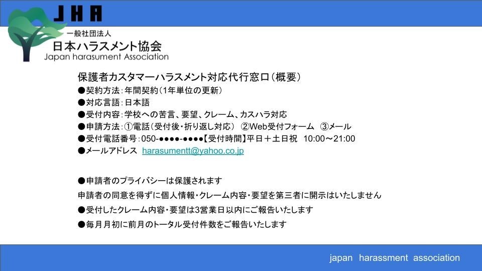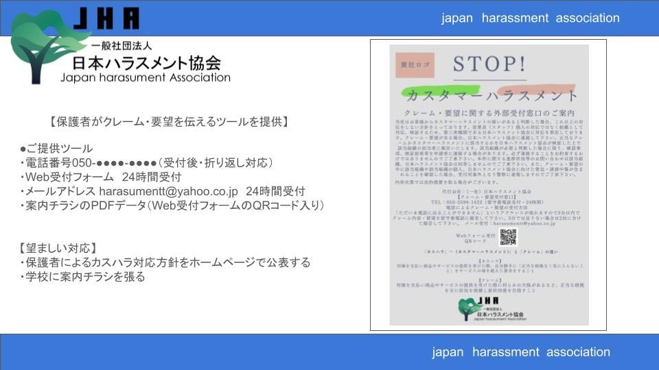 ⚫️保護者の要求内容がカスタマーハラスメントに該当する場合、日本ハラスメント協会から保護者に指導することができる