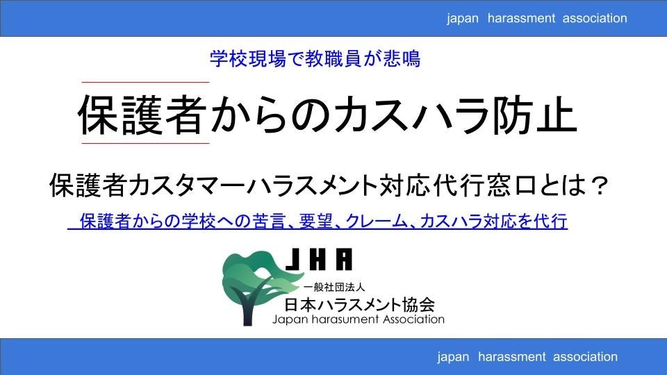 ハラスメント専門家として企業や自治体のハラスメント対策を支援する一般社団法人日本ハラスメント協会(本部事務局:大阪市西区、代表理事:村嵜要)は、保護者によるカスタマーハラスメント対応を第三者機関に外部委託できる、保護者カスタマーハラスメント(カスハラ)対応代行窓口サービスを開始いたします。学校、教育現場で教職員と保護者間のトラブルをきっかけに、保護者によるカスタマーハラスメントが発生しやすい傾向があります。保護者によるカスタマーハラスメントは社会的な課題になっていますが、本サービスを導入することで教職員の負担を大幅に軽減できることから、学校現場が抱える様々な課題解決への効果が期待できます。
