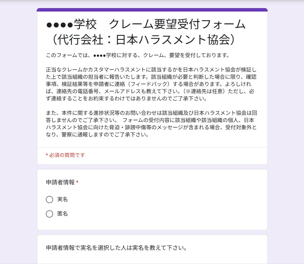 このフォームでは、●●●●学校に対する、クレーム、要望を受付しております。 正当なクレームかカスタマーハラスメントに該当するかを日本ハラスメント協会が検証した上で該当組織の担当者に報告いたします。該当組織が必要と判断した場合に限り、確認事項、検証結果等を申請者に連絡する場合があります。よろしければ、連絡先の電話番号、メールアドレスも教えて下さい。(※連絡先は任意)ただし、必ず連絡することをお約束するわけではありませんのでご了承下さい。 また、本件に関する進捗状況等のお問い合わせは該当組織及び日本ハラスメント協会は回答しませんのでご了承下さい。 フォームの受付内容に該当組織や該当組織の個人、日本ハラスメント協会に向けた脅迫・誹謗中傷等のメッセージが含まれる場合、受付対象外となり、警察に通報しますのでご了承下さい。