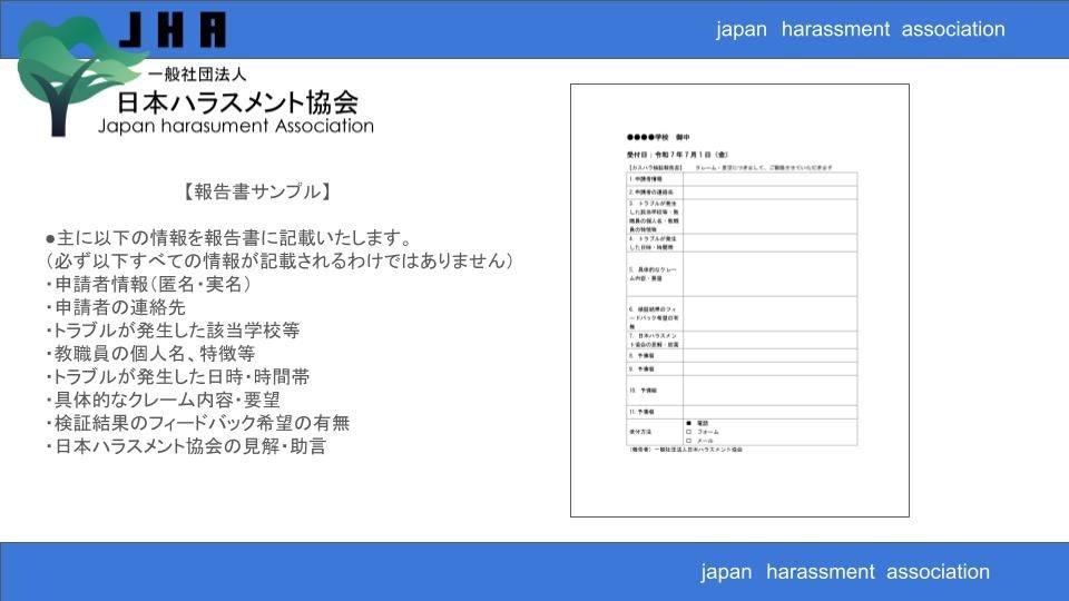【日本ハラスメント協会から学校に提出する報告書のサンプル】