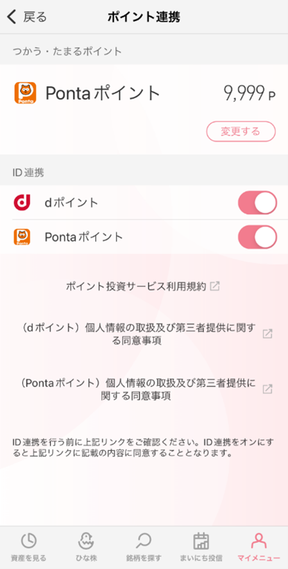 お客様は、当社アプリの「マイメニュー>ポイント連携」画面で、各ポイントと連携後に「たまる・つかえるポイント」として選択することで、ご希望のポイントでたまる・つかえるポイント投資サービスを利用することが可能です。