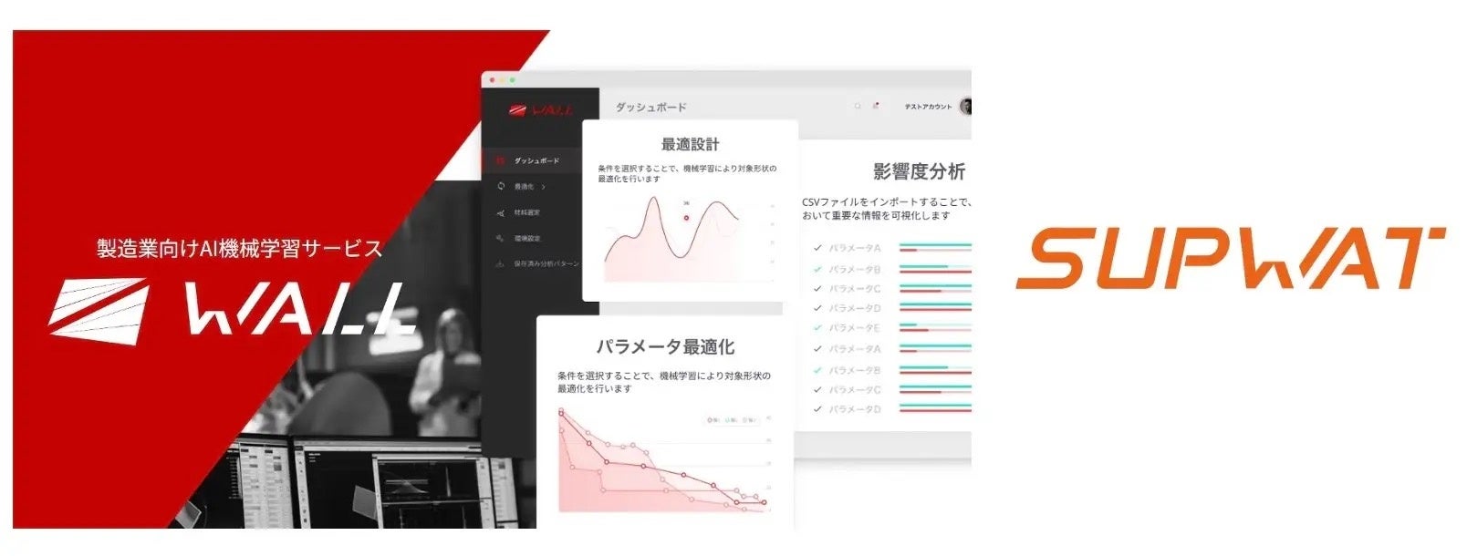SUPWATが開発・提供を進める「WALL」は、製造業のエンジニアリングチェーンにおける技術開発・設計・生産技術工程に特化して開発されたプラットフォームであり、エンジニアリング業務における実験および解析サイクルを、効率化・高速化、形式知化し、エンジニアリングチェーンのDXを実現するプロダクトです。データとAI等の先端技術を駆使した高度なモデリングにより、複数の制約条件下でのパラメータ最適化をはじめ、影響度分析や性能予測などを容易に実験や解析に利用することが可能となります。これまで、勘と経験に頼り莫大な時間とコストをかけて実施されていた実験・解析時の試行錯誤を、「WALL」の活用により効率化することでエンジニアリング業務の高速化を図ります。また、実験や解析における試行錯誤の結果をプラットフォーム上に保存することができるため、暗黙知であった個人の勘や経験を形式知化し、チーム内で共有しプロジェクトを効率化することも可能です。さらに、AIにより開発や設計の条件・組み合わせなどを新たに発見することが可能となるため、技術開発および設計の高度化にもつながります。2021年の提供開始以降、自動車メーカー、素材メーカー等製造業界の大手企業に導入を頂いており、「WALL」の活用により、研究開発工程の実験・解析時間を60%超削減することも実証されています。