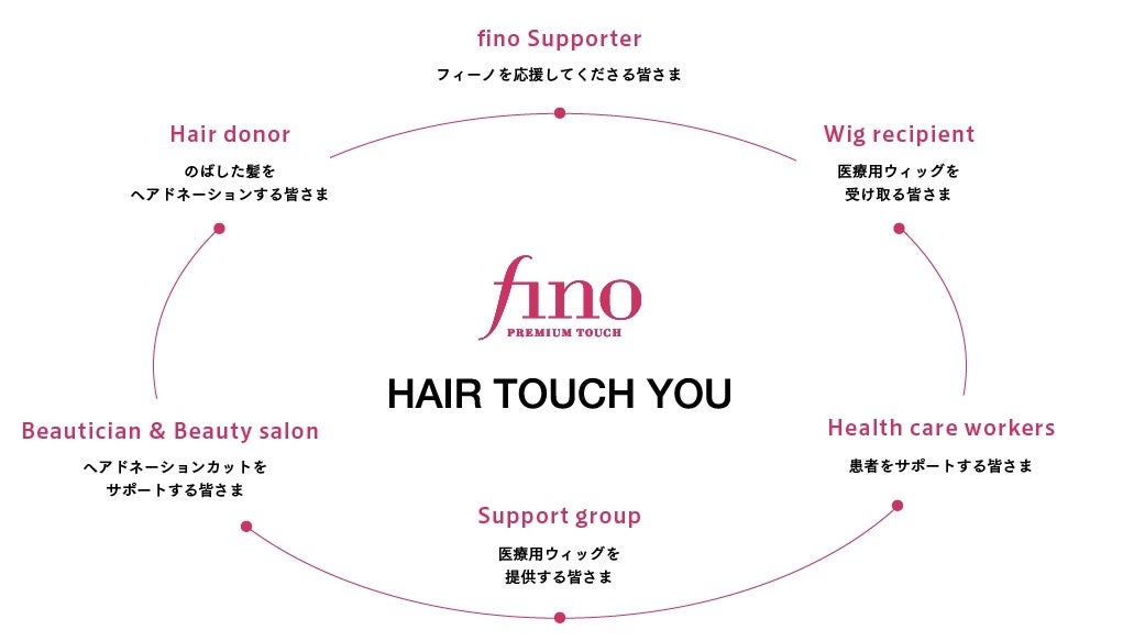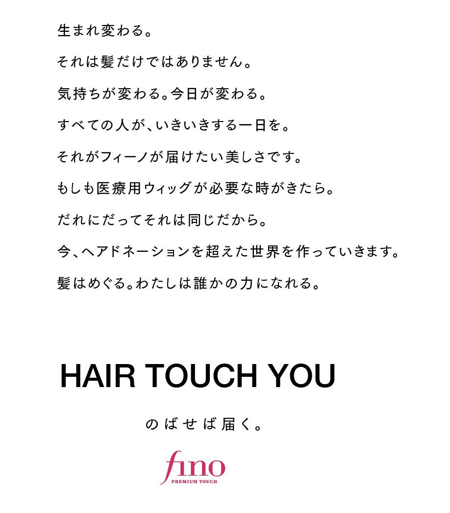 ヘアケアブランド「フィーノ」は、「まるで美しさが生まれ変わるような体験を」というブランドの想いのもと、お客さまに商品をお届けし、ブランド誕生以来今日まで多くの方の想いをいただきながら成長してまいりました。フィーノを通して感じていただいた「生まれ変わり体験(※1)」は、お客さまからもソーシャルメディアなどで数多く共有いただき、いまもなお生まれ続けています。このように、“髪”を通してたくさんの方々の気持ちを感動とともにつないできたフィーノだからこそできる、今回のプログラム【HAIR TOUCH YOU のばせば届く。】。すべての方に、その一日がより満たされ、気持ちまでもが生まれ変わるような体験をお届けするために、医療用ウィッグをとりまくすべての方をフィーノがつなぐプログラムです。