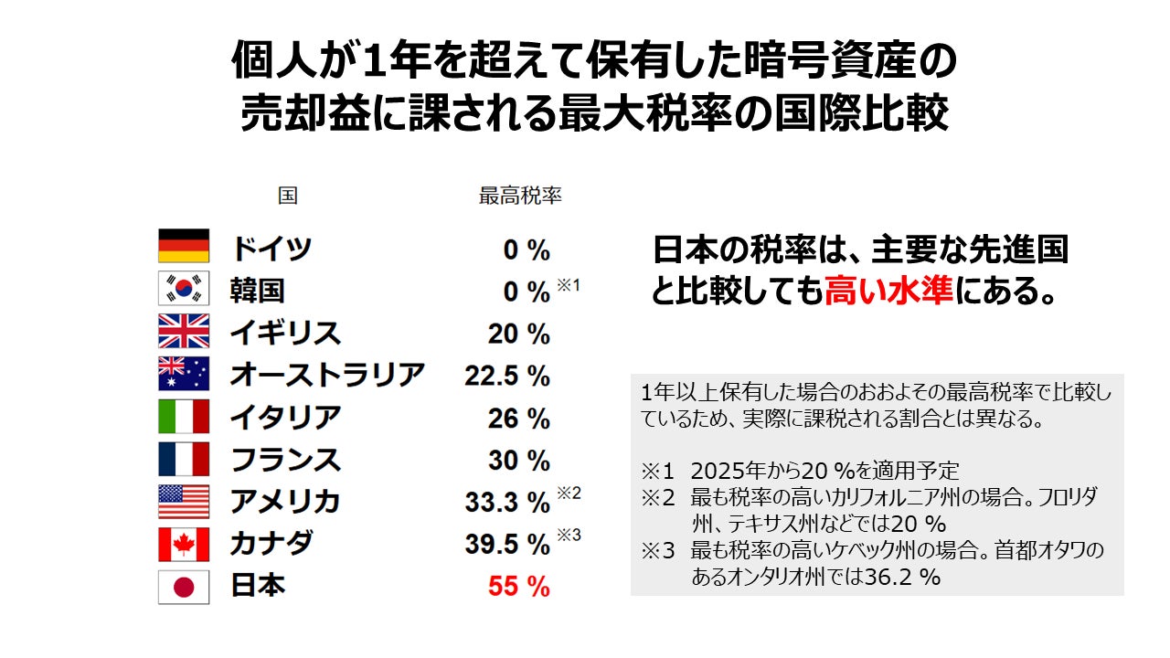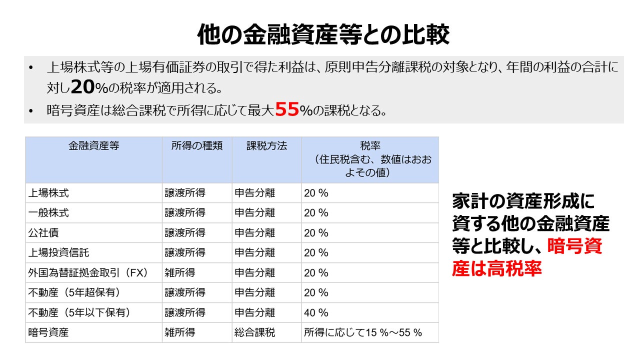 また、国内においても家計の資産形成に資する他の金融資産等と比較して、暗号資産は高い税率を課せられる状況にあります。