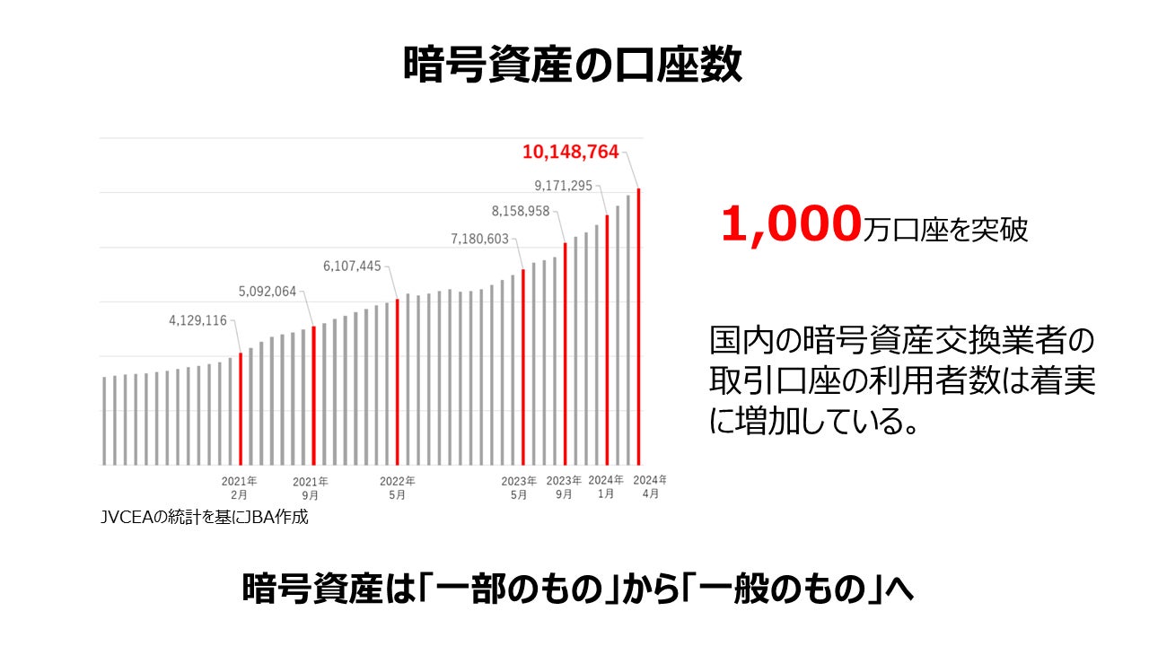 国内の暗号資産口座数は着実に増加しており、2024年4月には1000万口座を突破しました。このことは、暗号資産がかつてのように一部の人だけが保有する限定的なものではなく、一般へ広がり始めていることを示しています。