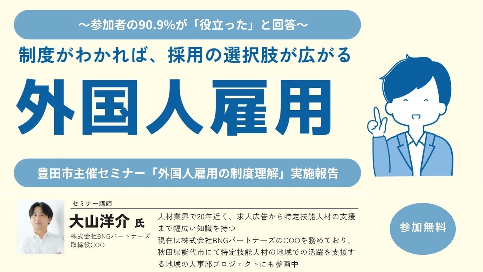 関連記事:豊田市主催「外国人雇用のための制度理解セミナー」にBNGパートナーズ 取締役 COO大山が登壇