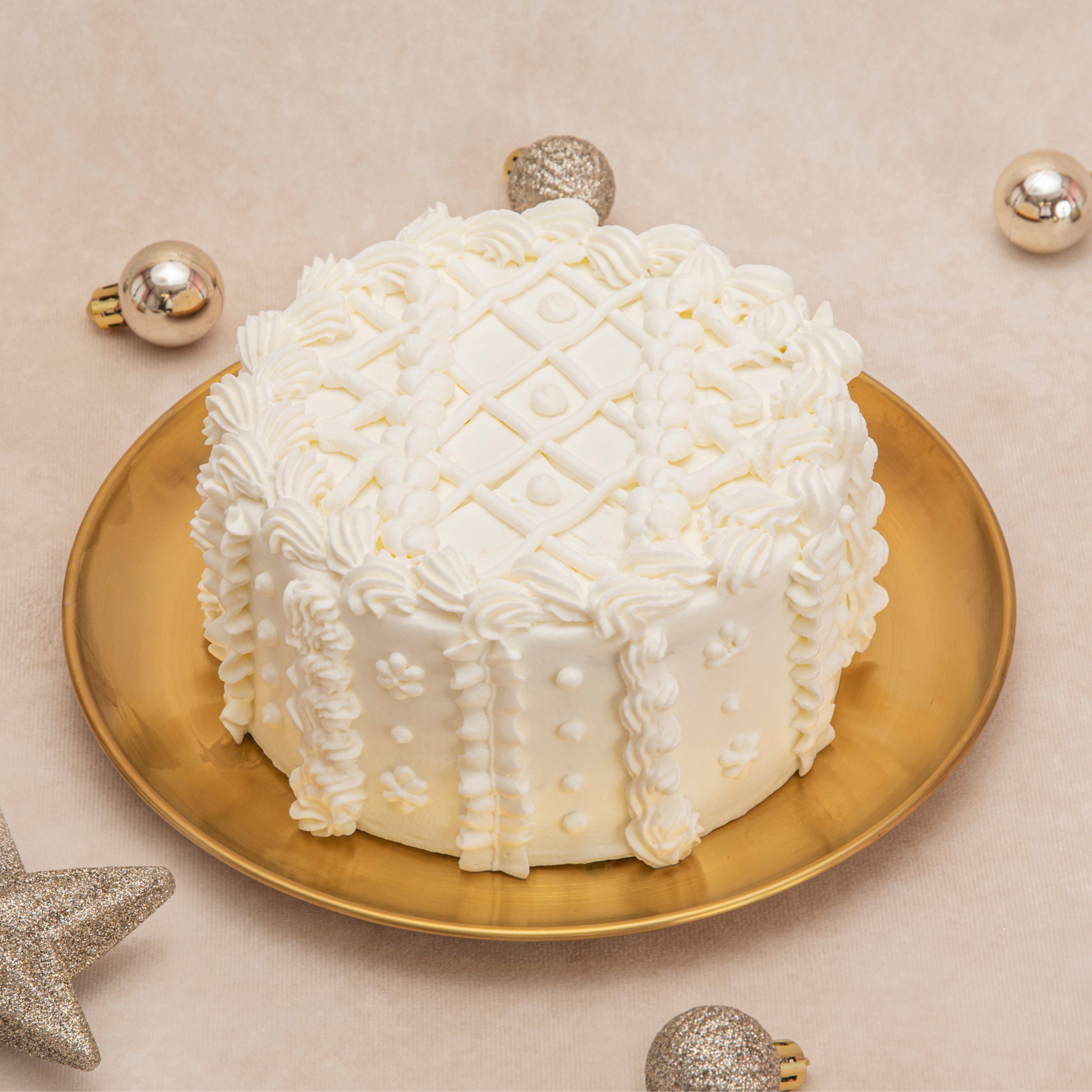 ほんのり甘いホイップクリームをたっぷり使用して仕上げた、まるで“ニット”のようなクリスマスケーキ。通常より高さを出し、オールホワイトながらもゴージャスに仕上げました。