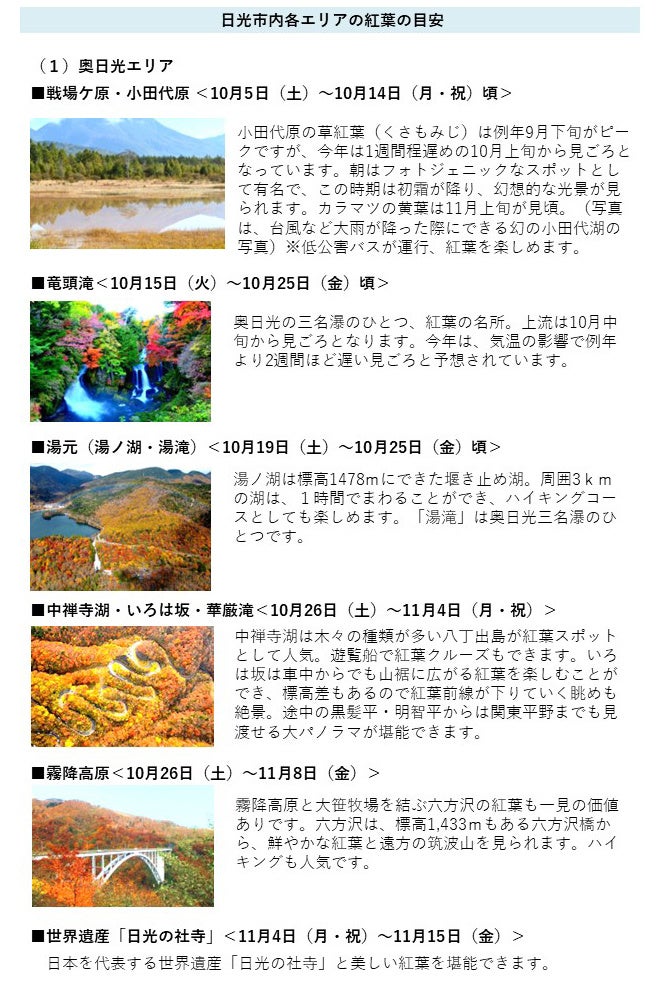 日光市は標高差があることから、9月下旬~11月の長い期間、場所を変えて紅葉が見られます。今年は気候の影響で例年に比べ、全体的に10日~2週間程遅い色づきが予想されています。このため、紅葉がピークを迎えている奥日光の一部エリア以外の様々な場所で、まさにこれから紅葉を楽しんでいただけます。