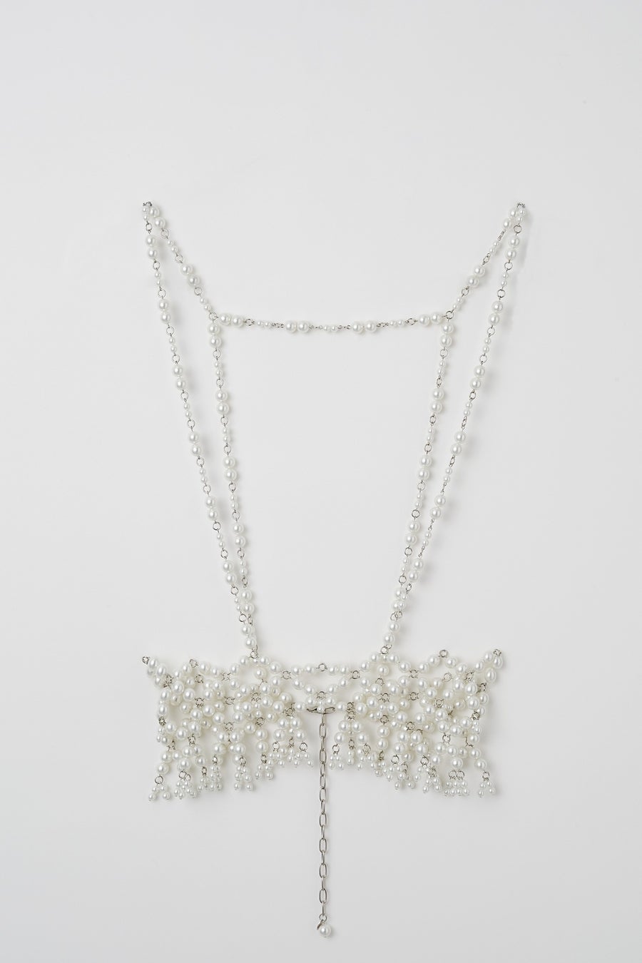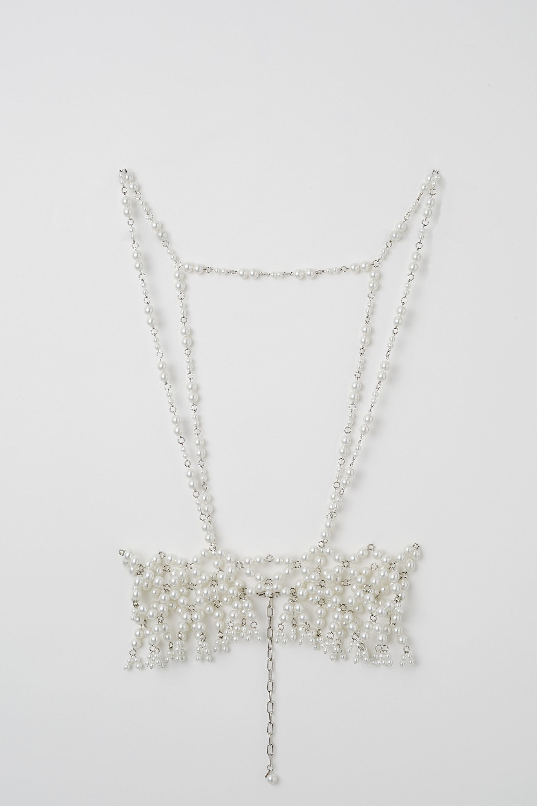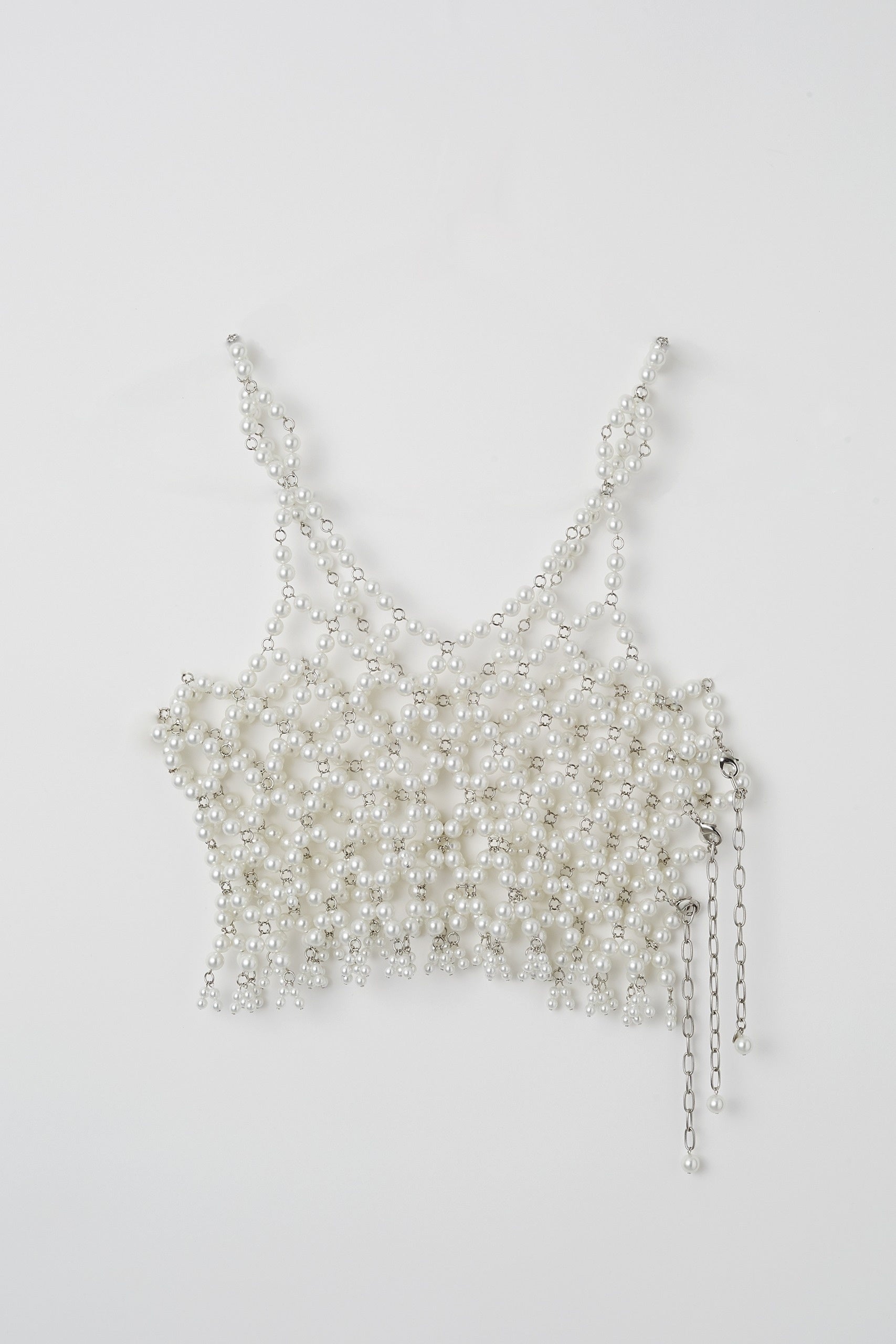 「Snow cover pearl bustier」は、デザイナーがフィールドワーク中にいつの間にか衣服に降りかかった粉雪が着想源となっています。雪の結晶をモチーフに、大きさの異なる2種類のパールを使用し立体感をプラスしています。