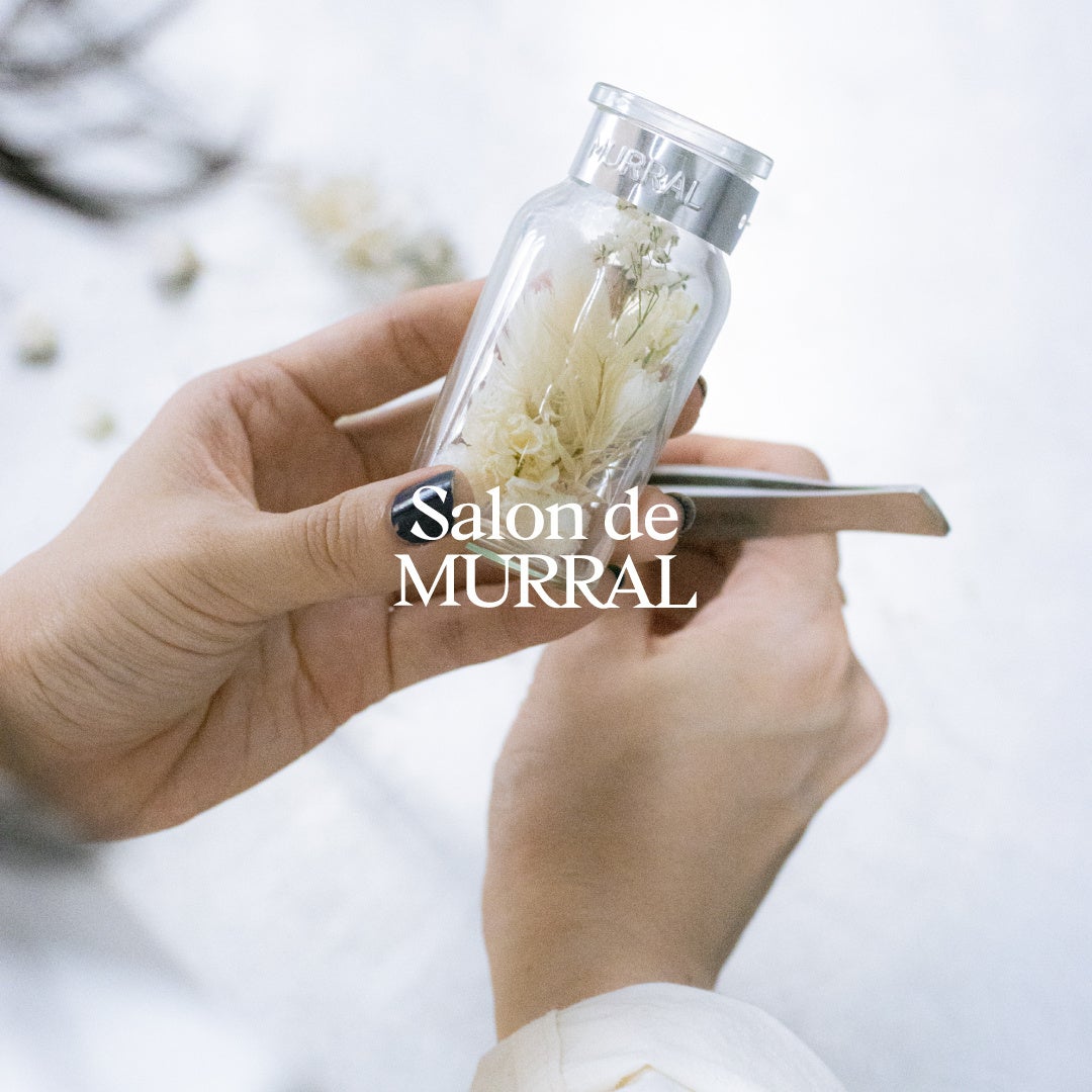 コレクションを象徴する”儚さ”の着想源となった雪化粧の景色を閉じ込めたようなドライフラワーが浮かぶフラワーボトルを会場で税込¥40,000以上ご購入のお客様に先着60個限定でプレゼントいたします。ボトルの側面には、MURRALの刻印プレートが付くオリジナルの仕様となっています。コレクションのキーワードのひとつである「永遠にはないもの」をボトルに浮かべ、世界観を堪能いただけます。
