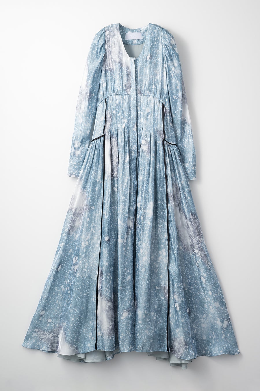 「”Letter” long dress」は5メートルの生地を1着に使用した存在感のあるロングドレスです。ふっくらとした自然なシワ感が特徴のタンブラー加工を施し、日常に寄り添ったアイテムです。シャープなラインにタックやギャザー、フレアを用いてシルエットを構築したドラマチックなドレスはボタンの開閉によってガウンとしても着用可能です。