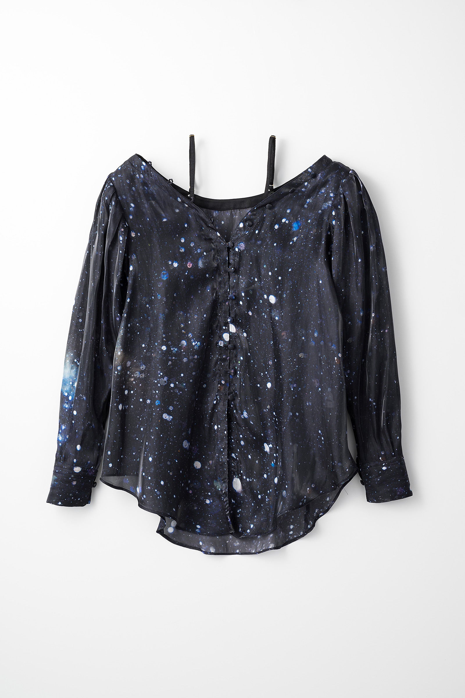 8月からデリバリーを開始する「“Letter” long shirts」は世界初となる人工雪の制作に成功した物理学者の中谷宇吉郎の著書である「雪は天からの手紙」を形にし、名もなき空から降り注ぐ粉雪をダイレクトにグラフィックへと落とし込んだアイテムです。付属の吊り紐とボタンの開閉によってオフショルダーにもなるブラウスは、素材に割繊糸を用いた生地を採用することでセンシュアルで繊細な光沢感を生み出します。