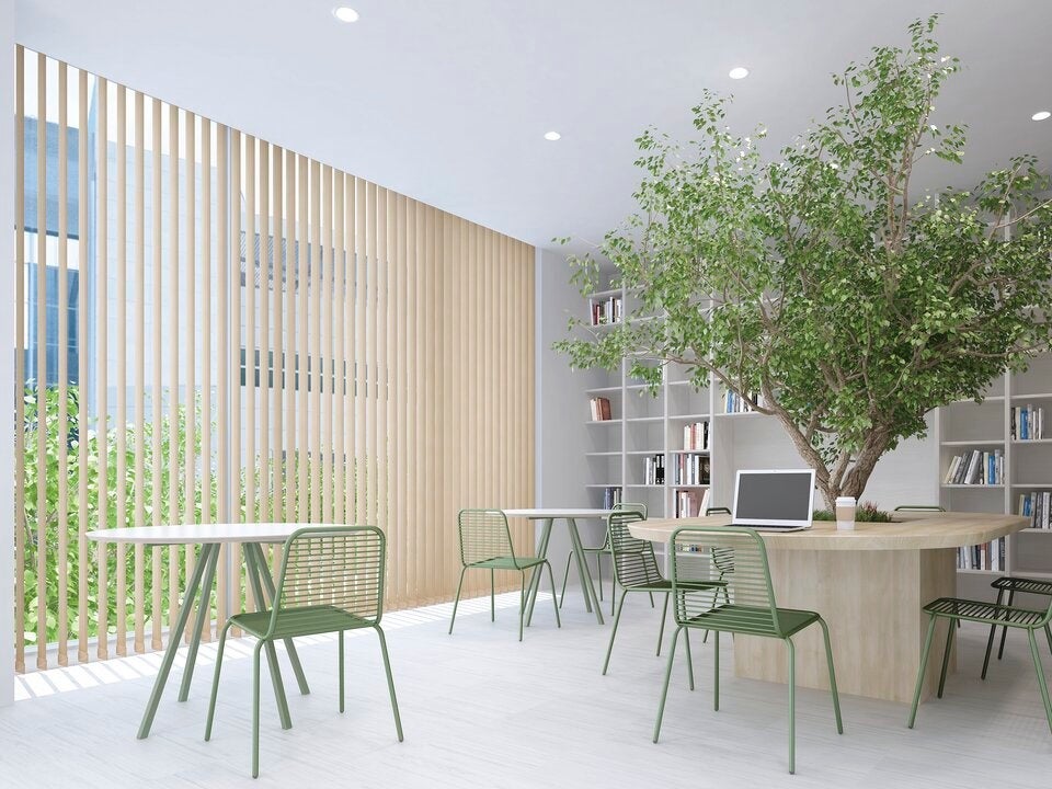 「グロスレス遮熱」は、遮熱の機能に加えて、新たに採用した塗料・塗装方法により、スラット(羽根)表面のグロス(ツヤ・光沢)をなくし、眩しさを感じる強い反射・ぎらつきを抑制します。光を拡散して室内に取り込むことで、心地よい明るさの室内環境を実現できるため、日射しの強い南面・東西面の窓や、屋外の景色を取り込みたい会議室や待合室にも最適です。