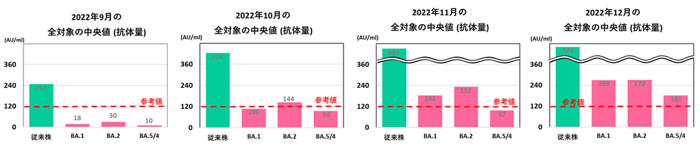 オミクロン株対応ワクチンの一般接種が2022年9月より始まり、9月にオミクロン株(BA.1)対応ワクチンが、10月にオミクロン株(BA.5)対応ワクチンが接種可能となりました。接種開始時の9月時点で、対象者の中央値を調べたところ、オミクロン株に対する抗体量(抗体価)がとても少ない状態でした。しかし、接種開始後の11月と12月の時点では、オミクロンBA.5に対する抗体が一定量認められました。