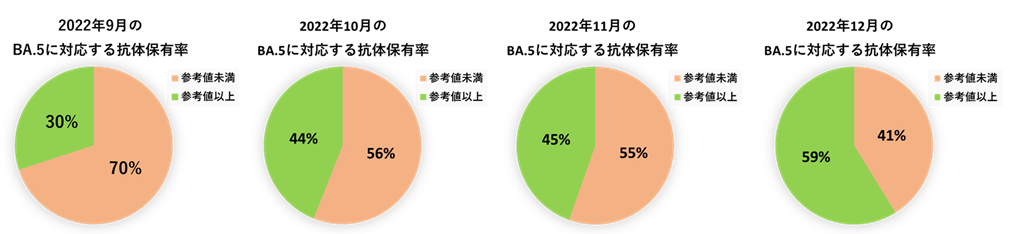 更に、12月になると、オミクロンBA.5に対する抗体が十分なレベル(参考値[※2])以上の対象者の割合が大幅に増加していました。本調査の結果を見ても、オミクロン(BA.5)対応ワクチンの接種率向上は、ワクチンの有効性(抗体の有無)と効果(抗体価)として現れ、期待された望ましい効果が発揮されていると思われます。
