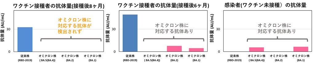 オミクロン株に対応する抗体の保有状況がそれぞれ異なっていることが分かりました。上図より、従来型ワクチン(1価)の接種者であるAさんとBさんで、オミクロン株に対応する抗体を保有するBさんと、検出されないAさんが確認されました。ただ、Bさんも、現在流行しているBA.5に対応する抗体が検出されていませんでした。そして、ワクチン未接種のCさんからは、オミクロン株に対する抗体が検出され、感染していたことが分かりました。また、Aさんについて、オミクロン株対応ワクチン(2価)を接種した後に追加調査をしたところ、オミクロン株に対する抗体量(抗体価)が上昇していました。
