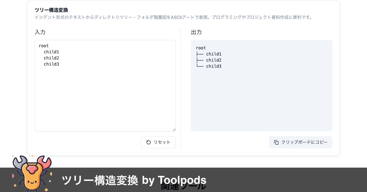『ツリー構造変換 by Toolpods』は、簡単なインデント形式(スペースやタブで深さを表したテキスト)を入力するだけで、自動で見やすい階層図を作ってくれる便利なツールです。