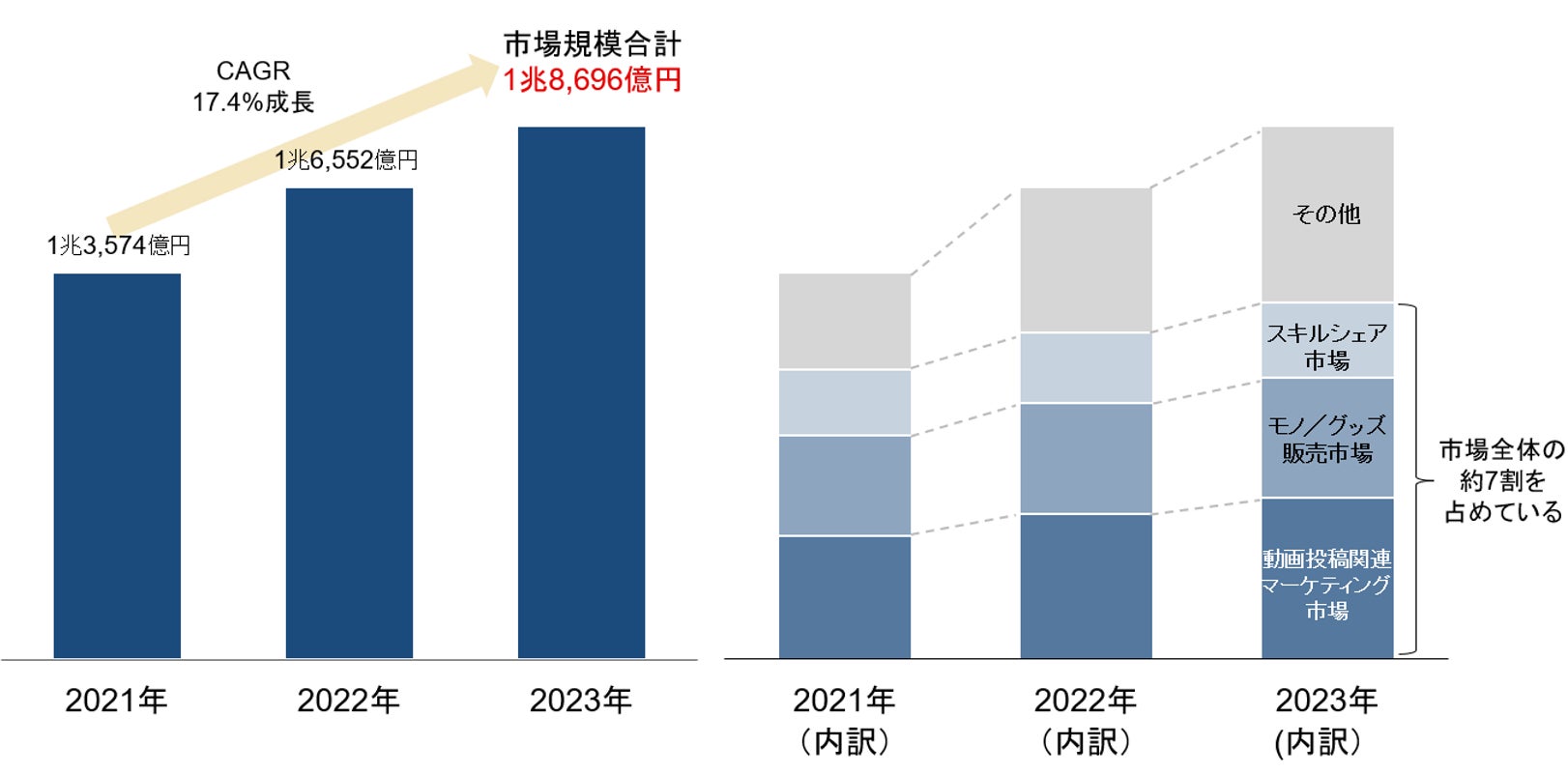 2023年の国内クリエイターエコノミー市場規模は1兆8,696億円と推計され、前年から13.0%増加しました。市場は引き続き堅調な成長を見せており、2021年からの年平均成長率(CAGR)は17.4%に達しています。主要な収益源として、モノやグッズ販売、スキルシェア、動画投稿関連の広告等が市場全体の約7割を占めています。