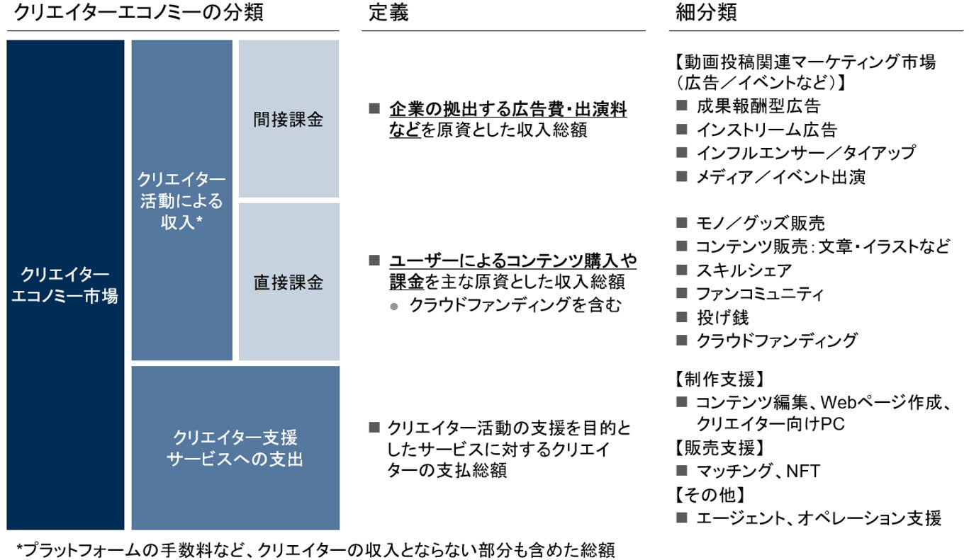 本調査では、クリエイターエコノミーに関連する企業やサービスを「プラットフォーム」と「支援サービス」の2つに大きく分類しました【図表1】。