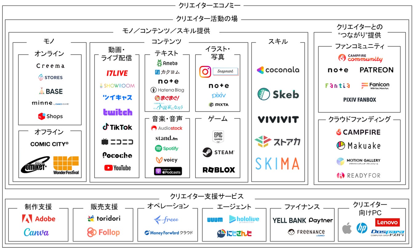 一方、「支援サービス」は、クリエイターの活動をより円滑に進めるためのツールやサポートを指します。たとえば、クリエイターが創作物を制作する際に活用する動画編集ツールやクリエイター向けPC、クリエイターと企業をつなぐマッチングプラットフォーム、さらには確定申告をはじめとした事務手続きやオペレーションをサポートするサービスが含まれます。これらの支援サービスは、クリエイターの活動効率を高めるとともに、活動の幅を広げる重要な役割を果たしています。