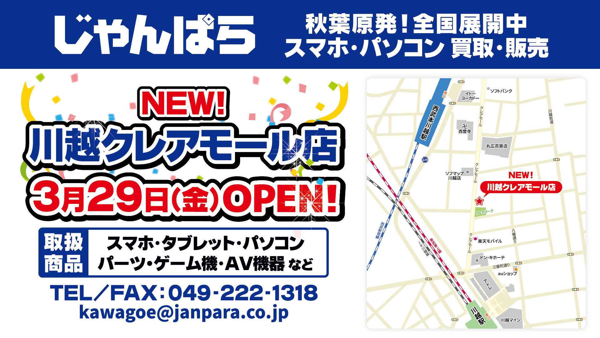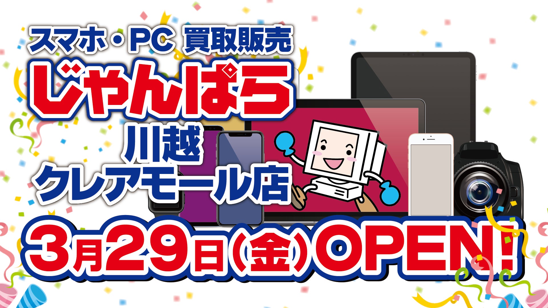 埼玉エリア2店舗目!スマホ・PC等買取販売「じゃんぱら川越クレアモール店」3月29日(金)グランドオープン!