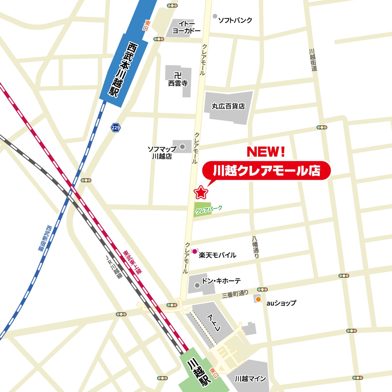 川越駅と本川越駅を結ぶ川越市の中心・川越クレアモール商店街のなかでもクレアパークのすぐ近くに立地し、埼玉西部の皆様のデジタルライフを積極的にサポートしてまいります。