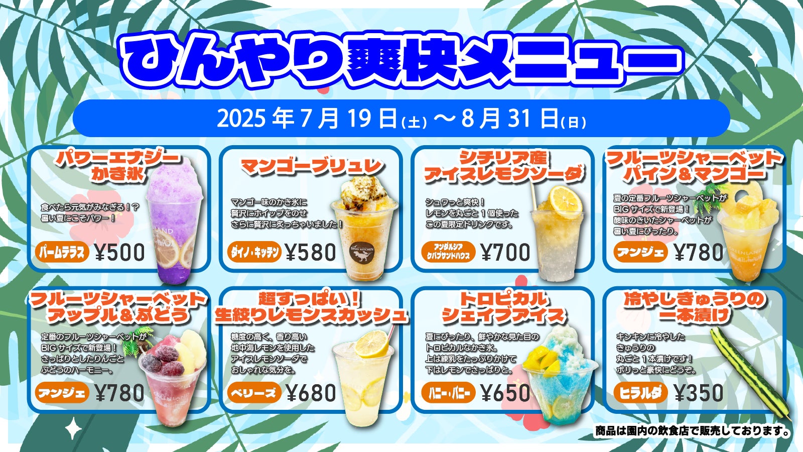 2025年7月19日(土)~8月31日(日)の期間中、園内の飲食店のうち8店舗でこの夏限定のひんやり爽快メニューを全8品販売します。