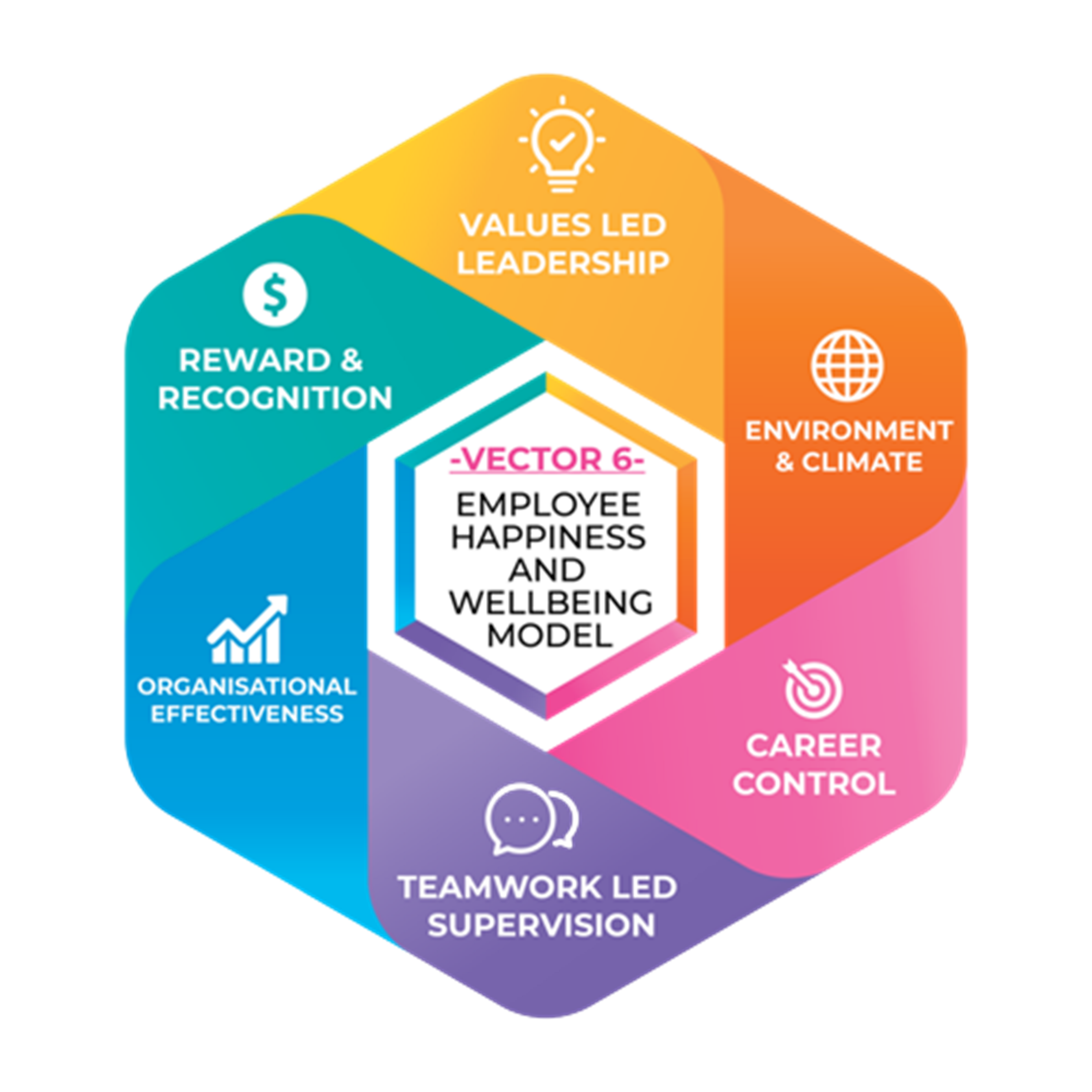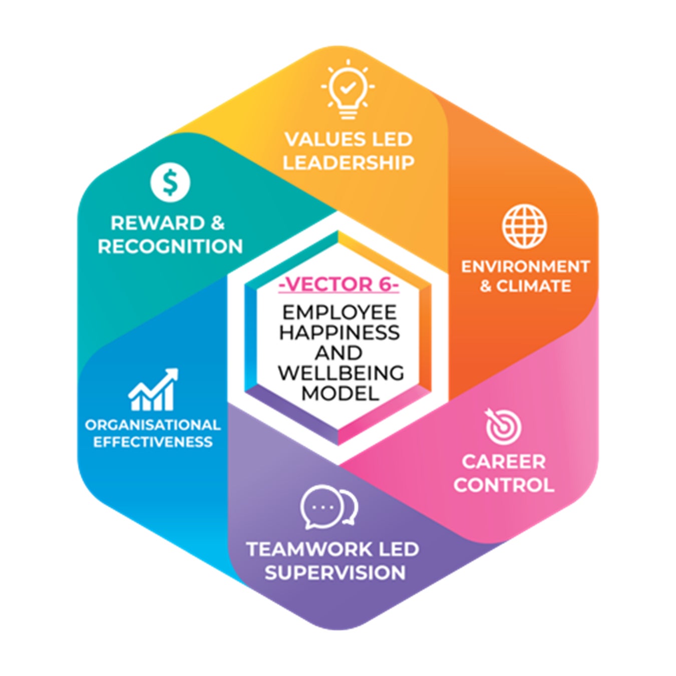 従業員幸福度および顧客体験の向上に関わる主要な研究、また理論や原則に基づいており、従業員のWell-beingに関する目標を達成するために強化すべき主要な要素:VECTOR6を定義し、これらをもとに改善のための明確な手順をまとめたものです。