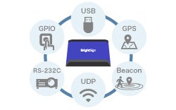 RS-232C、USB、GPIO、UDP、Beaconで外部機器に接続し双方向のコントロールが可能です。オプションのセンサーを併用することで、プログラム開発なしにインタラクティブサイネージを簡単に実現できます。